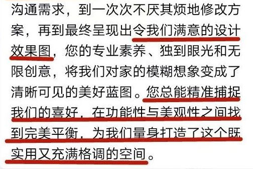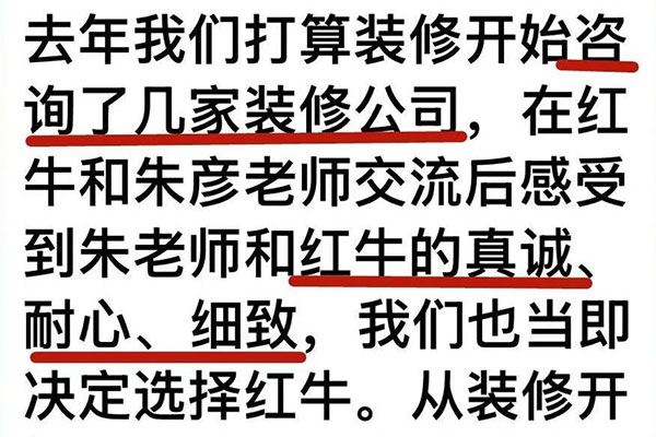 這次找紅牛裝飾公司裝修,也是朋友介紹的。各方面安排比較及時到位,質(zhì)量控制上也比較好,總體感覺滿意。設計師顧娟工作負責,業(yè)務能力、協(xié)調(diào)能力都較強,為這次裝修的滿意完工奠定了基礎!項目經(jīng)理錢新平統(tǒng)籌能力較強,工作負責,安排的水電工、瓦工、木工和油漆工都比較認真負責,手藝也不錯,保證了裝修的施工質(zhì)量。工程監(jiān)理宋昕業(yè)務精湛,工作認真負責,對裝修施工考慮全面,對質(zhì)量要求嚴格,經(jīng)常深入工地巡查,發(fā)現(xiàn)問題及時指出,很好地為施工質(zhì)量把了關。這次找紅牛裝飾公司裝修的體驗是愉快的,謝謝各位!